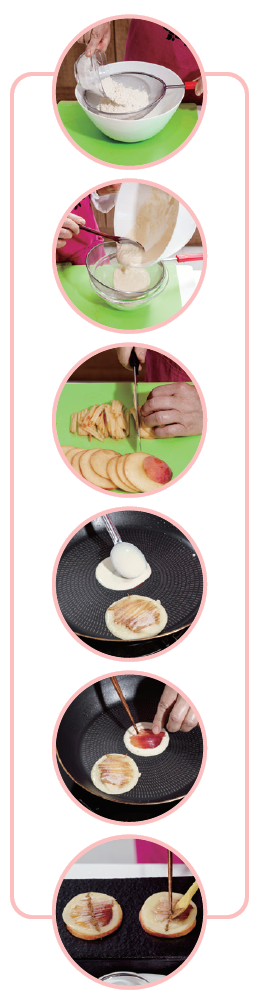➎ 반죽의 가장자리가 익어 가면 채 썬 복숭아를 올리고, 그 위에 약간의 반죽을 추가해 고정한다.