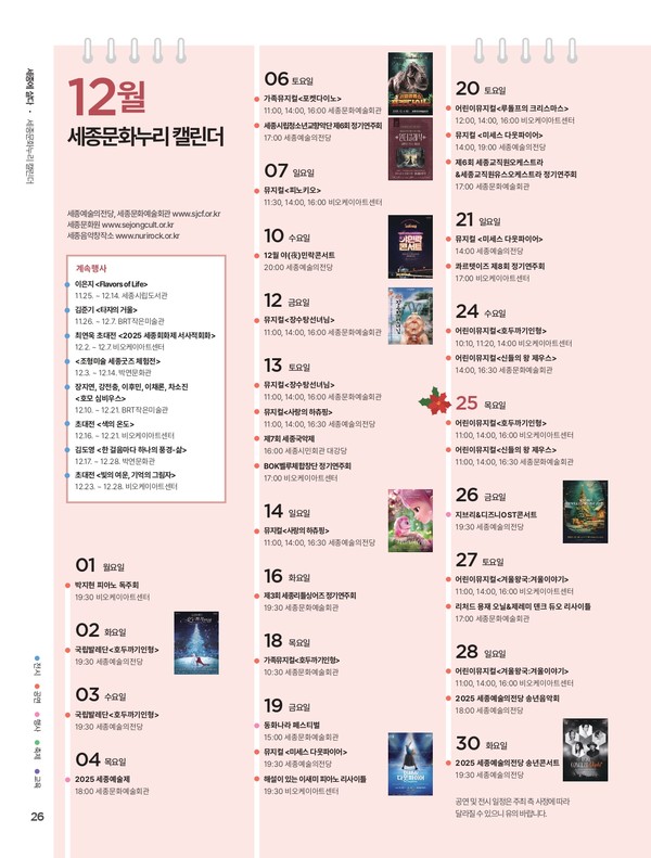 첨부파일 : 12월 세종문화누리 캘린더.pdf 세종 시정소식지 webmaster@news.sejong.go.kr 기자의 다른기사 저작권자 © 풍요로운 삶 품격있는 세종 무단전재 및 재배포 금지 이달의 소식지 [의회소식] 세종시의회, 제4대 의회 마지막 회기 개회 [세종소식] 청년 주택임차보증금 이자 최대 4.1% 지원 [세종소식] 숙련기능인력 비자 추천 대상자 모집 [세종소식] 국내 최고 수준 대회서 세종 테니스 저력 알렸다 [세종소식] 세종충남대병원 소아응급실 축소 [세종소식] 중동사태 대응 ‘중소기업 피해 대책반’ 운영