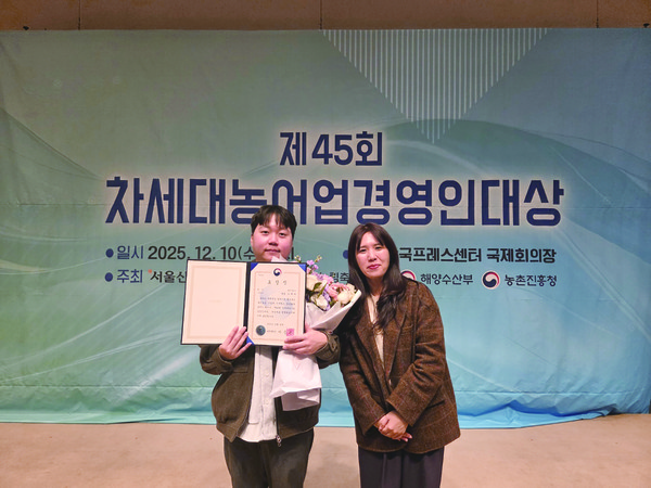 세종시4-H연합회 소속 청년농업인 유태욱(사진 왼쪽) 하이모스 대표가 지난달 10일 한국프레스센터 국제회의장에서 열린 ‘2025년 농업인의 날’ 유공 정부포상 시상식에서 차세대 농어업경영인대상 분야 본상을 수상했다.