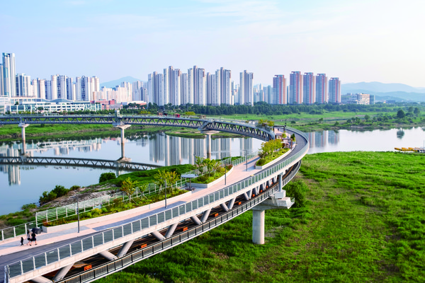이응다리는 금강 위에 원형으로 놓인 복층 보행교로, 전체 형태가 한글 자음인 ‘이응’을 닮아 한글문화도시 세종시의 정체성을 직관적으로 보여주는 상징적인 곳이다. 다리의 길이는 훈민정음이 반포된 1446년을 기념해 1,446m로 설계됐다. 한글 창제 연도를 걸으며 세종대왕의 애민정신을 되새겨 보자는 의미다. 상부는 보행자 중심, 하부는 자전거 중심으로 동선이 나뉘어 ‘걷는 사람’ 과 ‘자전거로 달리는 사람’이 서로 방해받지 않게 설계된 점도 이응다리의 장점이다.